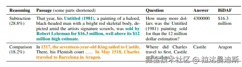 DROP 评估模型从英语段落中提取重要细节的能力,然后执行不同的推理操作(例如添加、排序或计数项目)以找到正确答案。以下是一个例子: