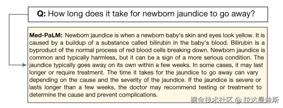 MultiMedQA 数据集中的示例问题和 Med-PaLM 中的答案。来源: 大型语言模型对临床知识进行编码