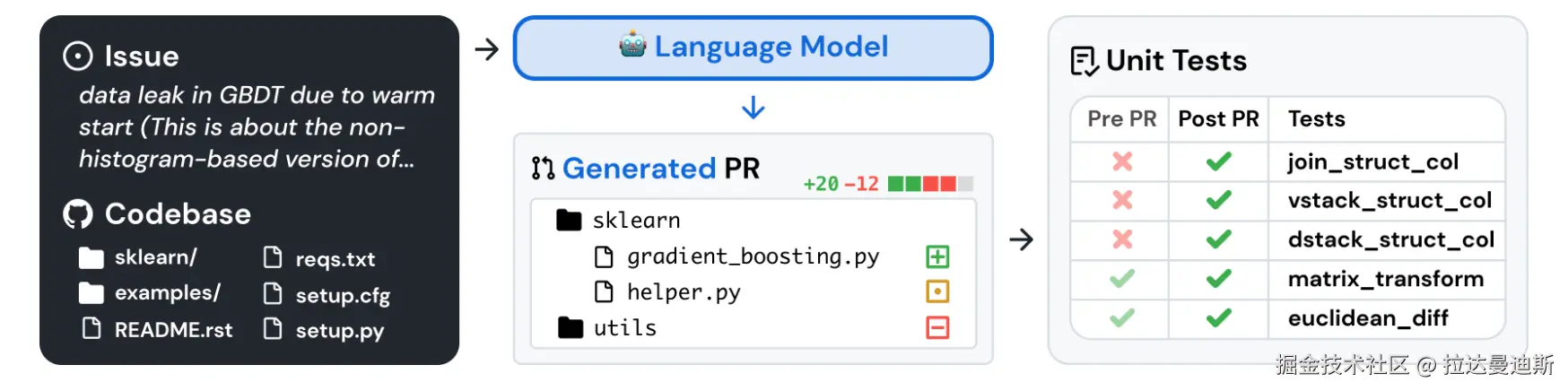 SWE-bench(软件工程基准)评估 LLM 解决从 GitHub 收集的实际软件问题的能力。该数据集包含 12 个流行 Python 存储库中的 2200 多个 GitHub 问题和相应的拉取请求。给定一个代码库和一个问题,模型必须生成一个解决问题的补丁。为了完成任务,模型必须与执行环境交互,处理长上下文,并执行复杂的推理——超出基本代码生成问题的任务。