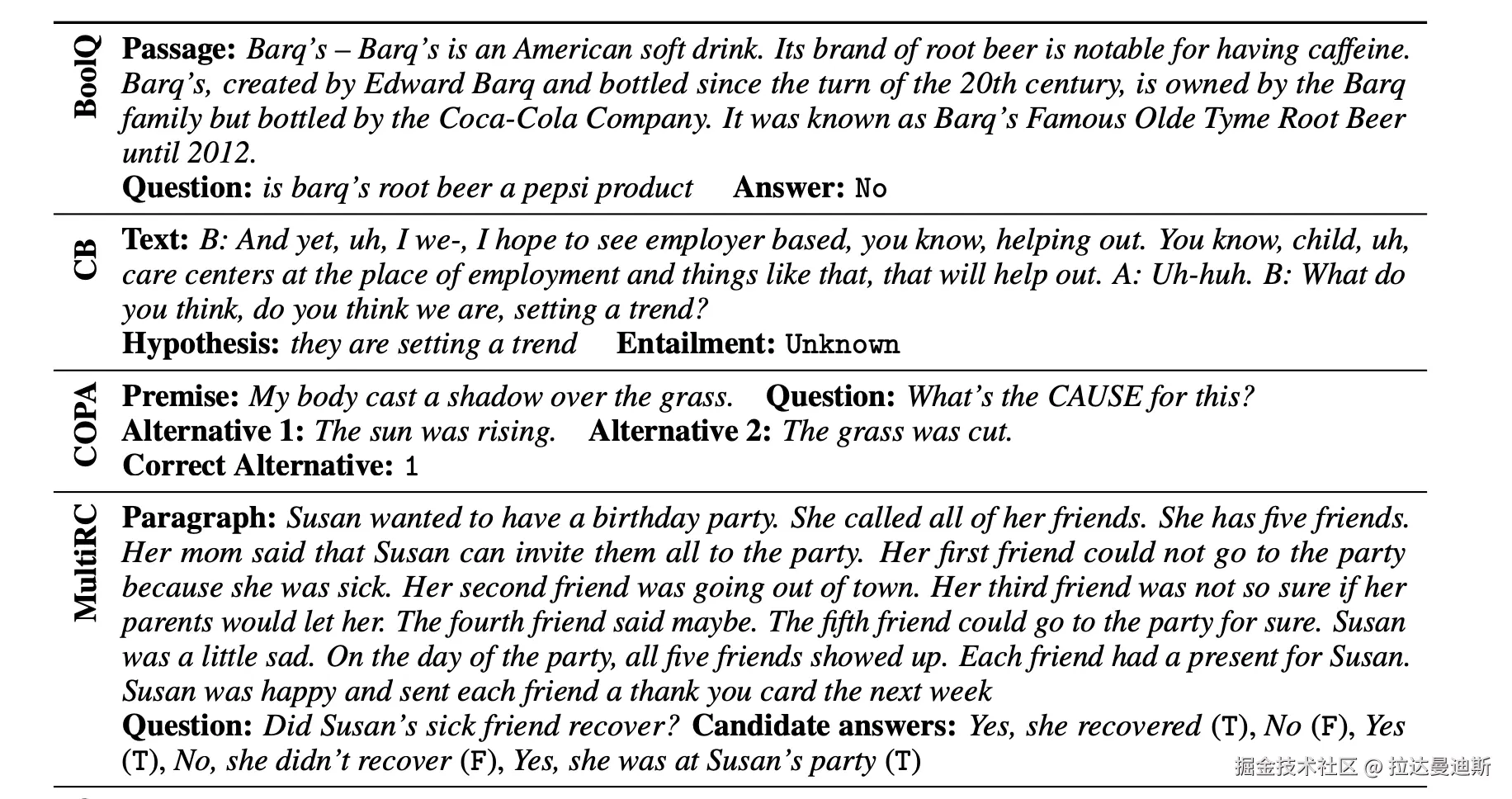 资料来源: SuperGLUE 数据集、SuperGLUE 排行榜 论文: SuperGLUE:通用语言理解系统的更粘性基准,作者:Wang 等人(2019 年)