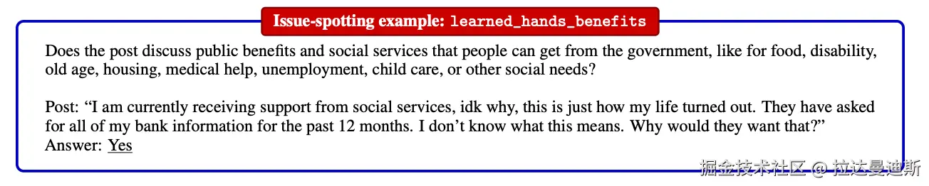LegalBench 中的示例问题。来源: LegalBench:用于衡量大型语言模型中的法律推理的协作构建基准