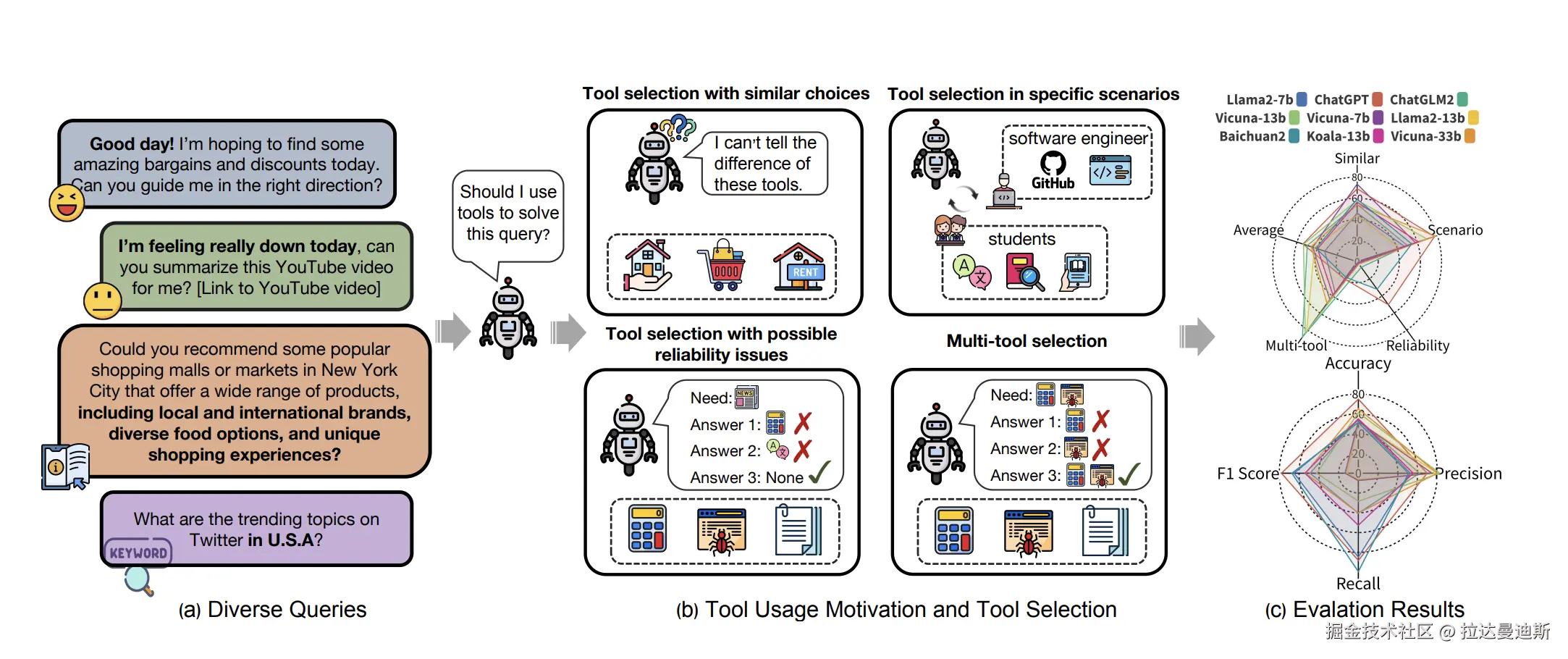 MetaTool 是一个基准测试,旨在评估 LLM 是否具有工具使用意识并能正确选择工具。它包括 ToolE 数据集,其中包含触发单工具和多工具场景的提示,并评估四个子任务中的工具选择。对九个 LLM 的实验结果表明,大多数 LLM 在有效工具选择方面仍面临挑战,揭示了其智能能力的差距。