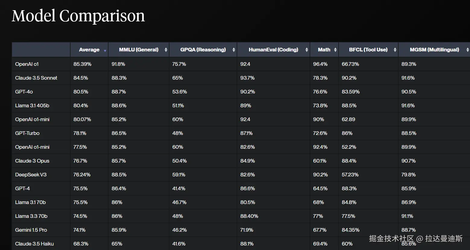 对于通用能力(MMLU):GPT-4o 以 88.70% 领先,其次是 Meta Llama 3.1 405b(88.60%)。