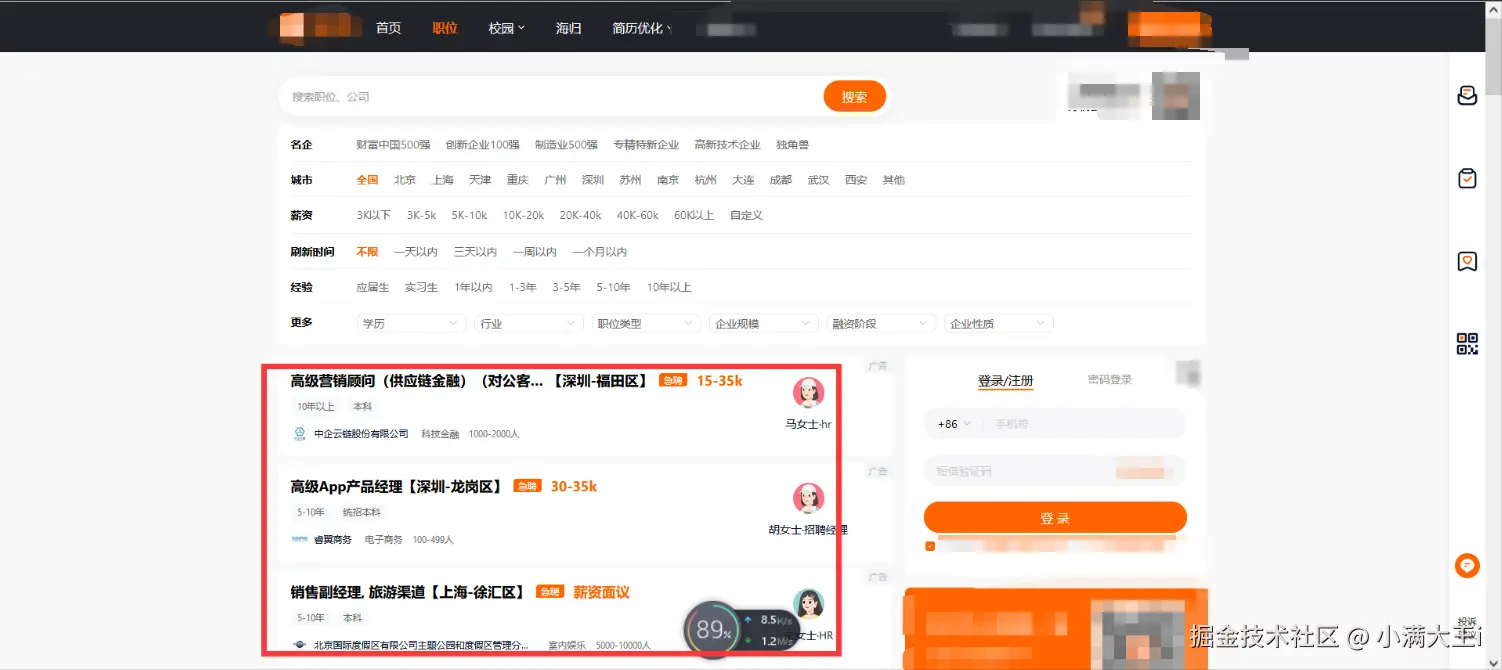 爬虫目标为某招聘网站,首先可以看到博主这里没有登录注册也可以岗位信息,那接下来写代码就不用去登录: www.liepin.com