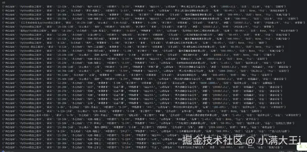 {'岗位名称': title, '薪资': salary, '办公地点': dq, '年限要求': requireWorkYears, '学历要求': requireEduLevel,