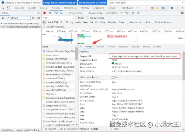 3、点击Headers查看接口地址,等一下我们需要用到:
