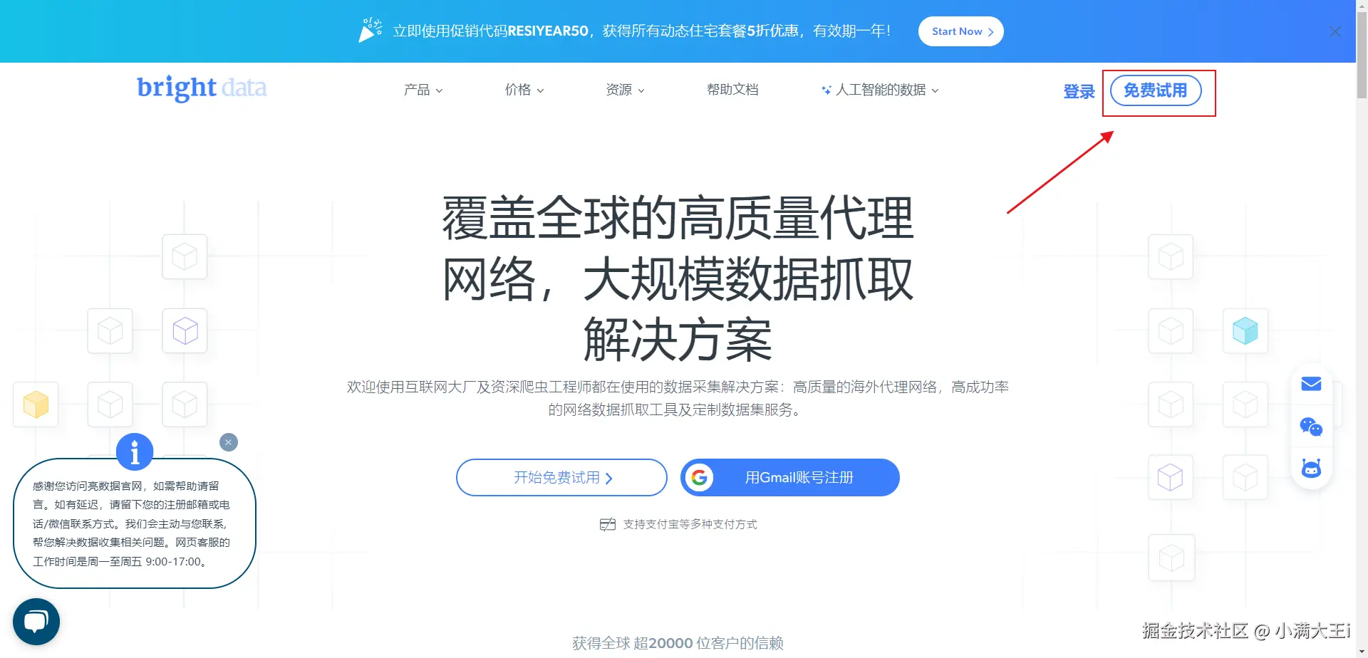 博主使用的是亮数据家的动态住宅代理IP,因为是住宅IP隐匿性更强,动态切换安全性更高,个人感觉还不错,并且可以免费使用: