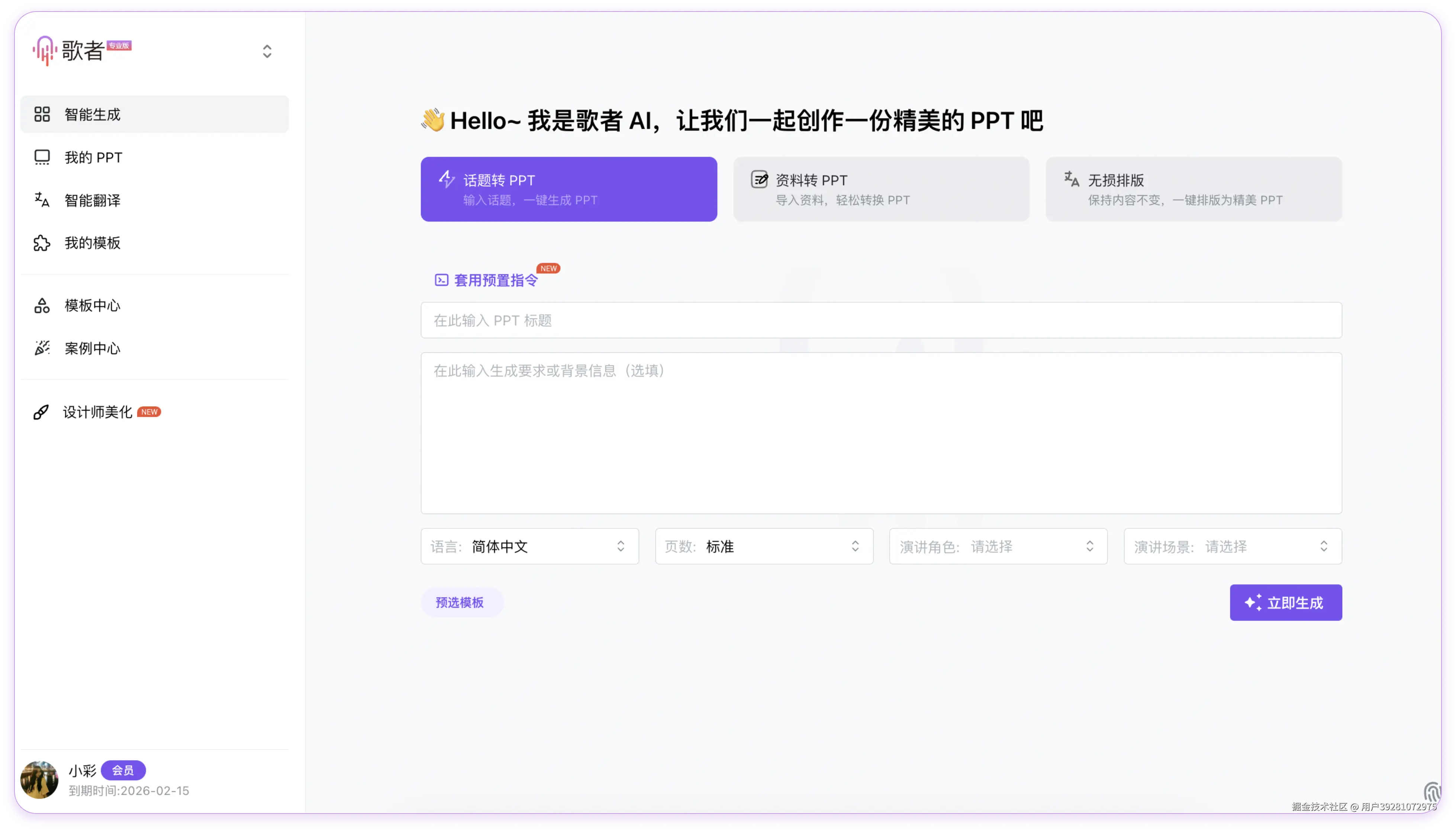 但现在,有一款 AI 生成 PPT 工具正在扭转这个局面 —— 歌者 PPT❗️歌者 PPT 不仅仅是一个 AI 生成工具,它专注于生成更高质量、格式更完整(包括母版和版式)的 PPT,致力于让生成的 PPT 真正可用。
