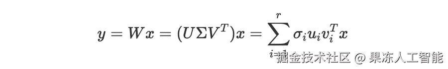 那么,这在实际中意味着什么?当我们执行矩阵乘法 y=Wxy = Wxy=Wx 时,我们可以用 SVD 分解重写它,如下所示:
