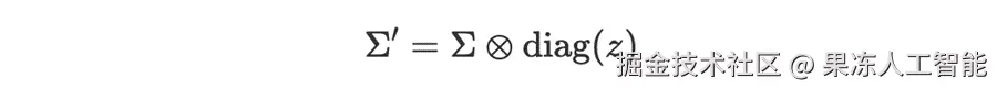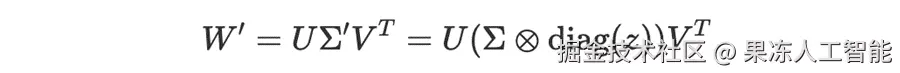 在这里,diag(z) 从向量 z 创建一个对角矩阵,而 ⊗ 表示逐元素乘法。基本上,专家向量的每个元素 ziz_izi 负责缩放相应的奇异值 σi\sigma_iσi。新的适配后权重矩阵 W′ 变成: