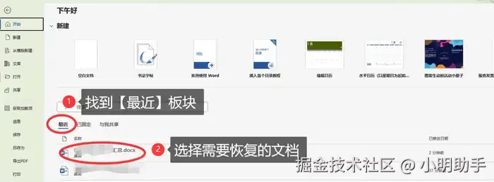 如果不小心将自己编辑好的Word文档给删除了,需要进行Word文档修复,或者说需要将word恢复历史文档,我们都可以先查看word文档里面的【最近】板块。这里是word文档自动替用户保存备份文件的地方,如果有需要恢复的文件都可以尝试在这里找回。我们只需要打开word文档,点击左上角的【文件】,就能看见【最近】板块了。