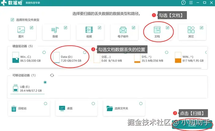 步骤1:在电脑中打开数据 蛙恢复专家,开启软件后进入首页,在上面选择好自己需要恢复的文件类型(需要恢复Word文档的话,可以直接勾选【文档】),最后选择自己需要扫描的位置后,单击【扫描】;