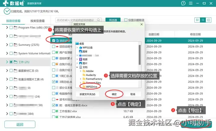 步骤2:静候一段时间,等待软件结束深度扫描后,在指定的位置选择自己需要恢复的word 文档后,点击勾选,然后按下【导出】;最后为其选择存放的合适位置。