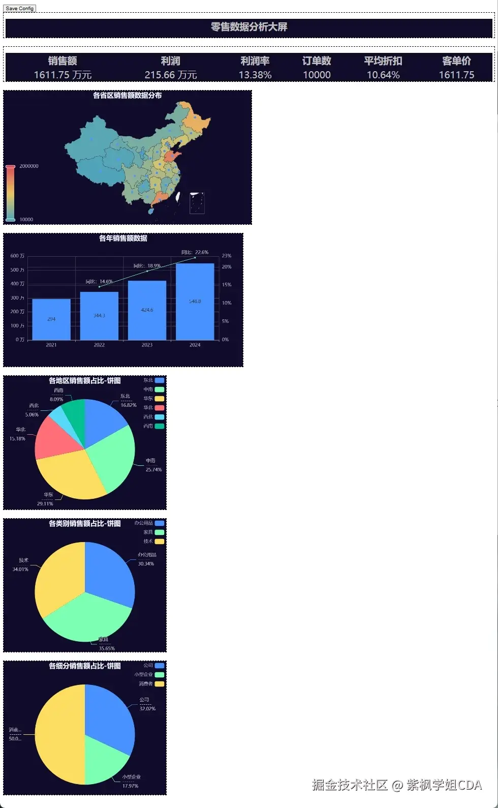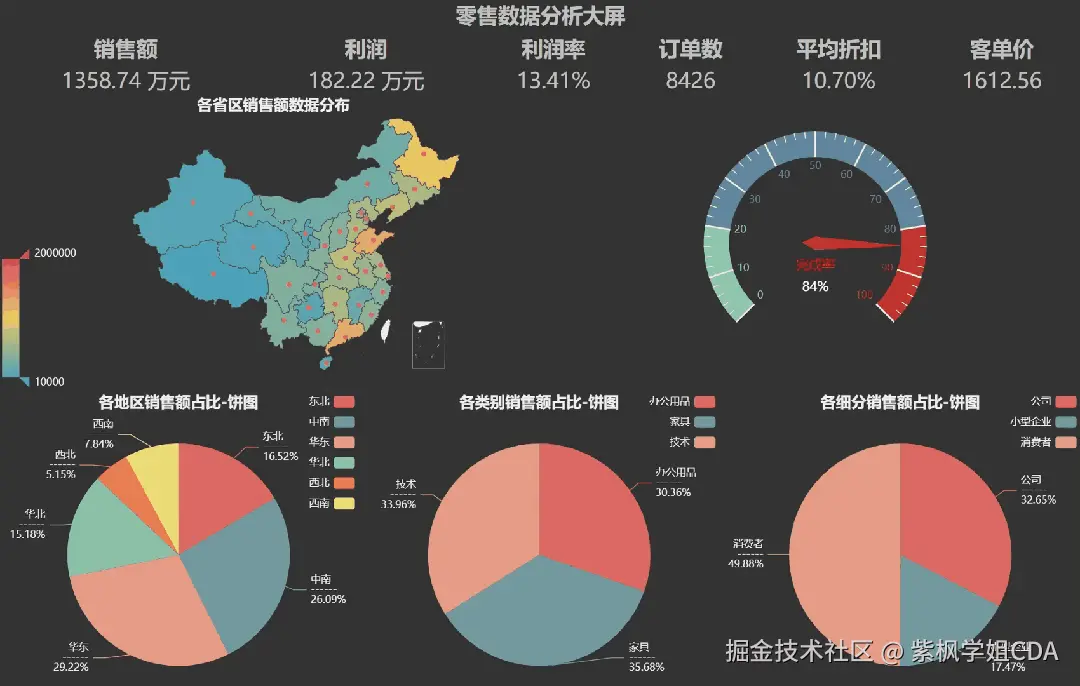 数据看板、仪表盘的设计和实现需要熟悉企业的业务,掌握指标的设计方法,这些内容在教材中有详细的介绍。本文作为教材的补充拓展给大家介绍一下如何基于Python工具包Pyecharts实现可视化看板,并实现看板实时刷新。最终效果如下图所示:
