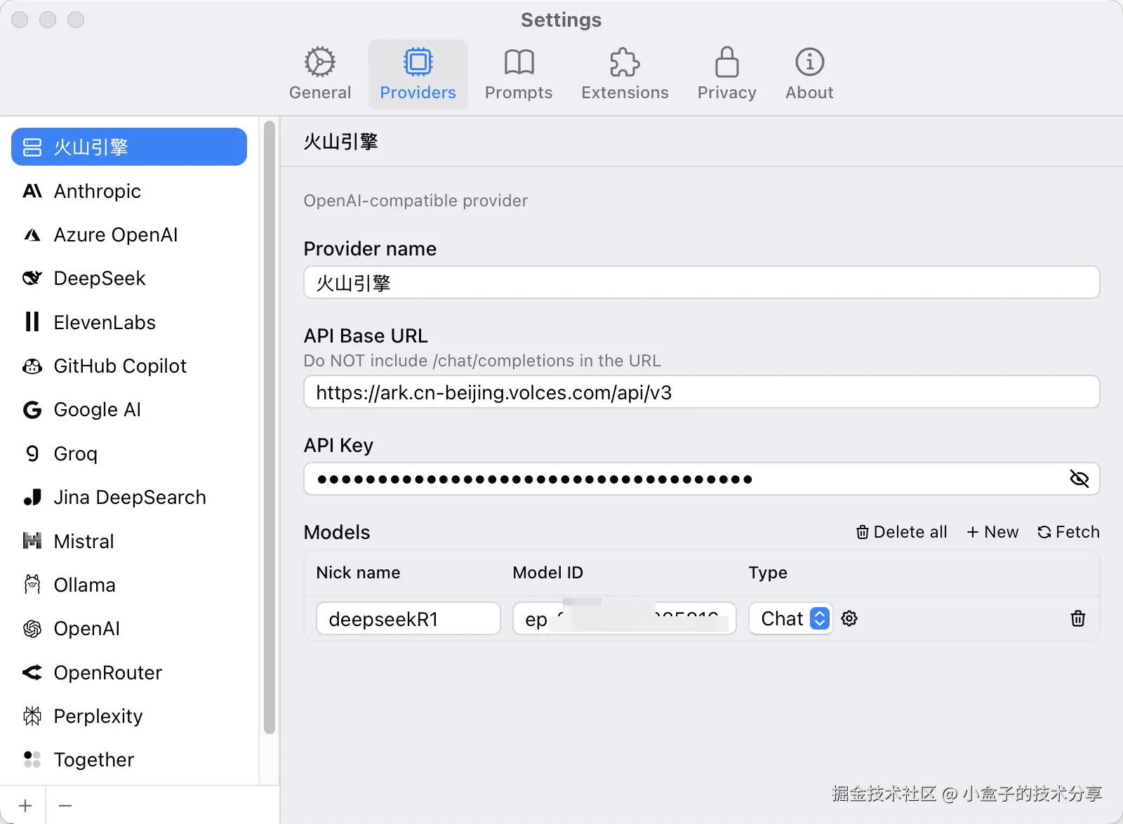 可以看到 ChatWise 是直接自定义添加 Provider 的,至少 API BaseURL,我是从文档示例中找到的: