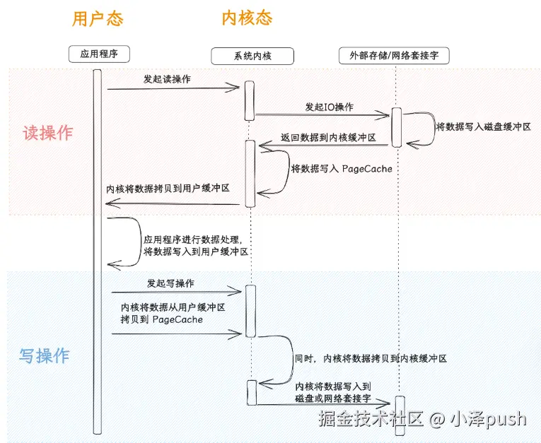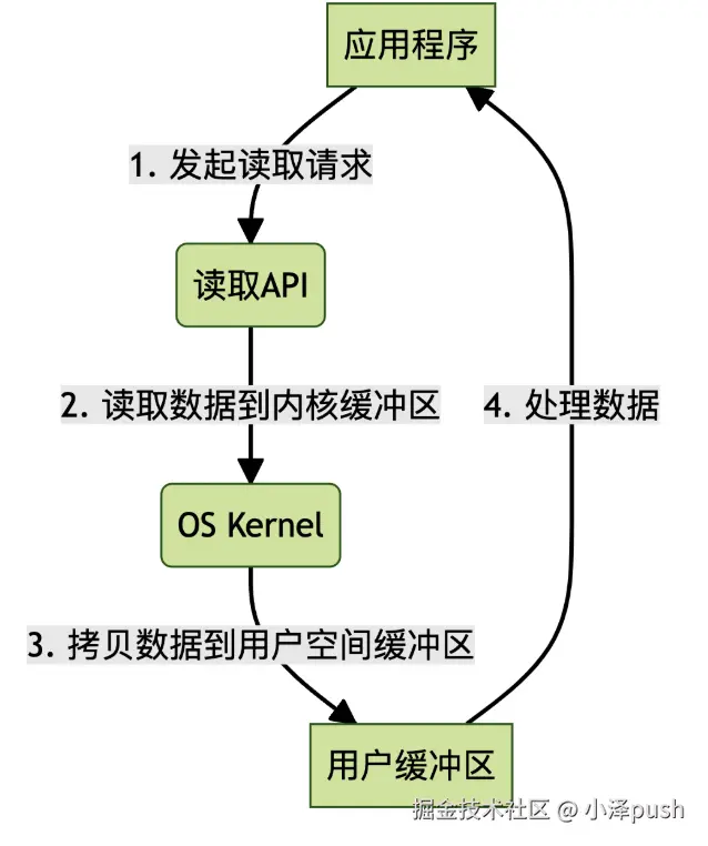 切到内核态 - > 读数据到内核缓存区 -> 切到用户态 - > 拷贝数据到用户缓存区