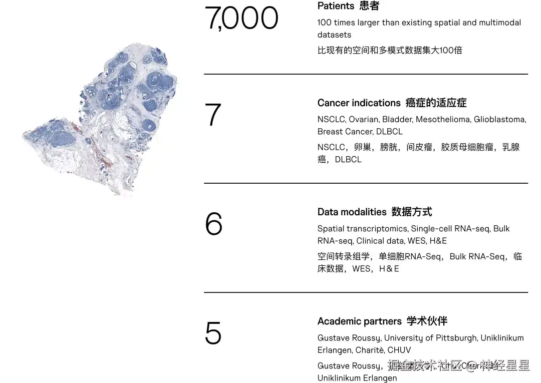 值得一提的是,2023 年 6 月,Owkin 曾发起了一项名为 MOSAIC(癌症多组学空间图谱)的项目 ,公司与顶级癌症研究医院等合作,针对 7 种难治性癌症(NSCLC,卵巢,膀胱,间皮瘤,胶质母细胞瘤,乳腺癌,DLBCL),征集来自 7,000 名患者的多模态数据。据悉,这是全球最大的癌症空间组学数据集, 比现有数据集大 100 倍。利用这些数据,Owkin 可以研发先进的人工智能算法,并提供治疗建议。