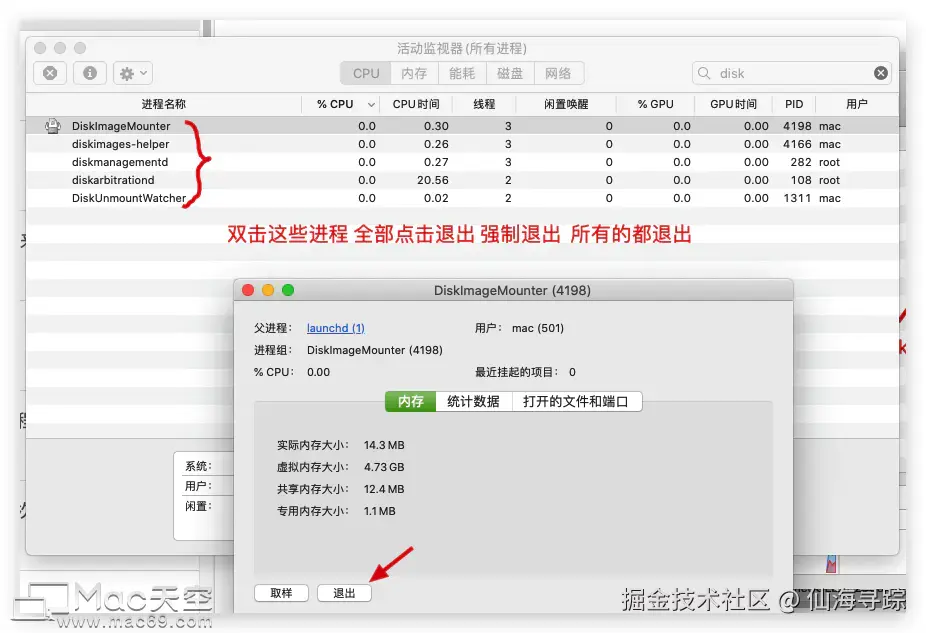 mac电脑打开dmg镜像文件提示资源忙如何解决 仙海寻踪 2025-02-14 101 阅读1分钟 有时候我们打开dmg安装包的时候 会出现如下 情况,这种可能是一些进程卡了,或者是自己打开的时候点击了跳过 偶尔会出现这样。 这个时候需要打开活动监视器 退出几个disk进程 就行了。首先在电脑屏幕右上角 状态栏 点击搜索按钮🔍 ,放大镜图标 搜索 “活动监视器” 然后回车打开 。 或者在启动台,搜索打开活动监视器。 在活动监视器的右上角输入搜索【disk】。 全部退出之后,你就可以发现 之前的dmg文件可以打开了。不会再出现资源忙了。