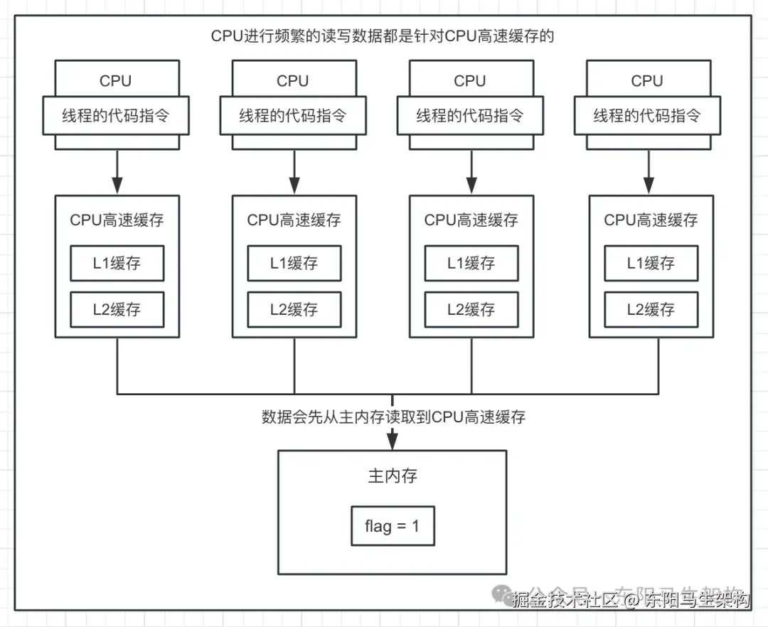 主内存的数据会被加载到CPU高速缓存里,CPU后续会读写自己的高速缓存。但多线程并发运行时,就可能引发各个CPU高速缓存里的数据不一致问题。
