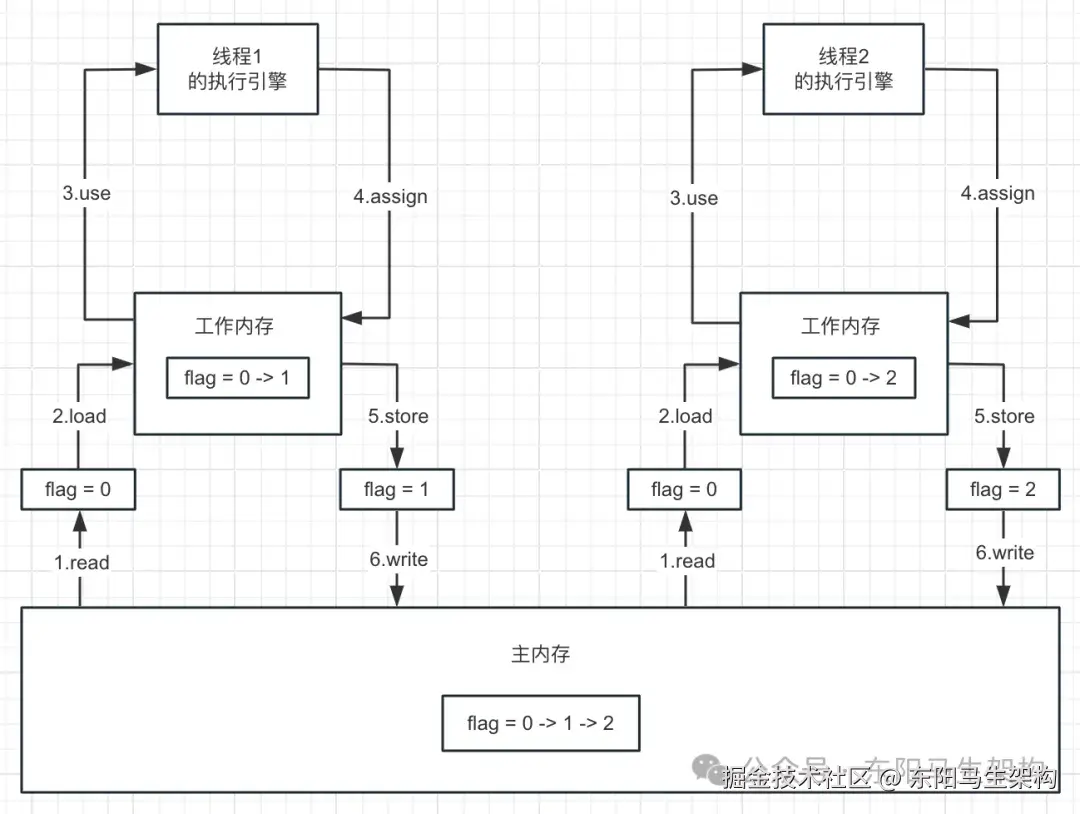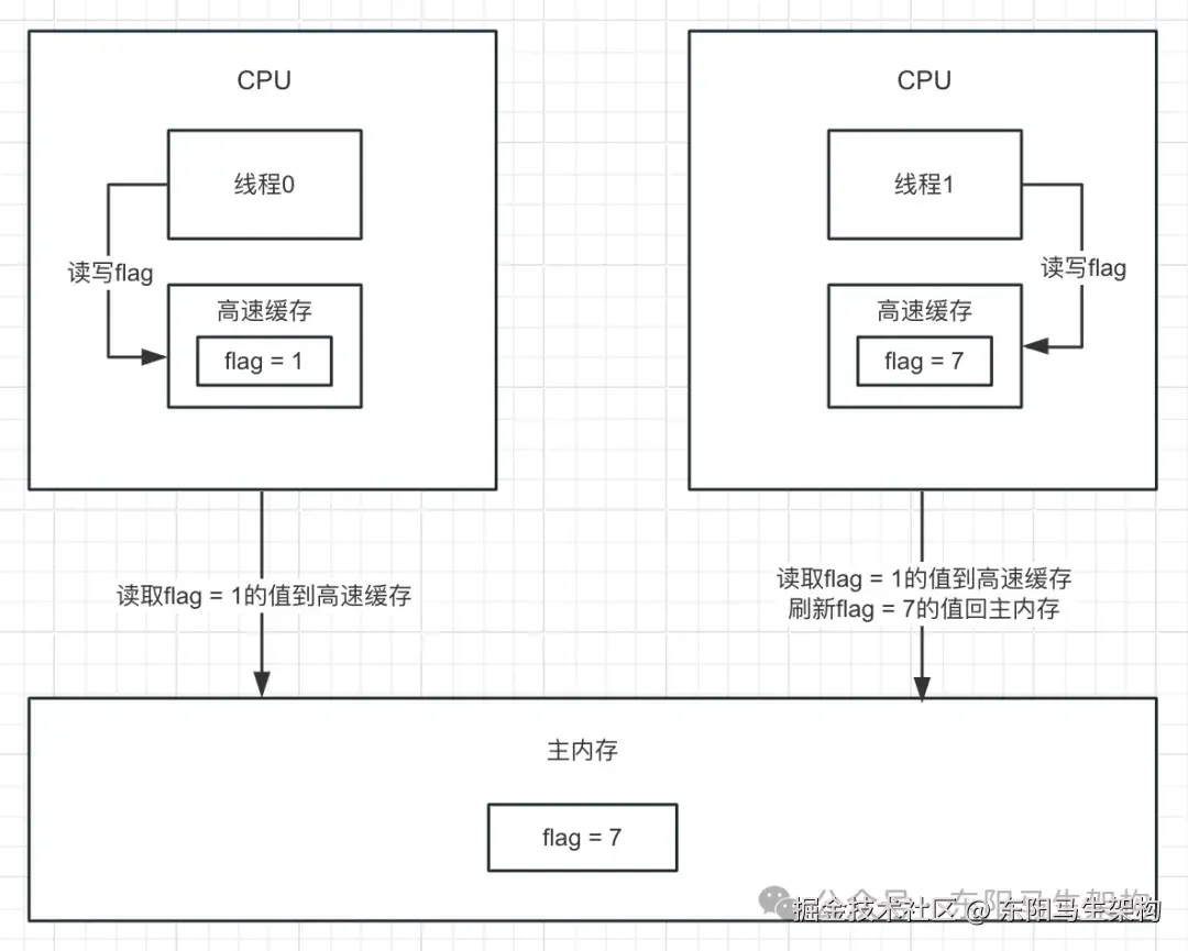 上面volatile的例子,在没有volatile修饰flag的时候:负责执行线程0的CPU一开始会将主内存的flag值读到其高速缓存。之后在执行线程0的指令时,便会在该CPU的高速缓存里读取flag的值。此时该CPU无法感知负责执行线程1的其他CPU对其高速缓存的flag的修改。因为负责执行线程1的CPU可能没有将其修改的缓存值及时刷新回到主内存,或者负责执行线程0的CPU可能没有主动更新主内存的最新值到其高速缓存中。