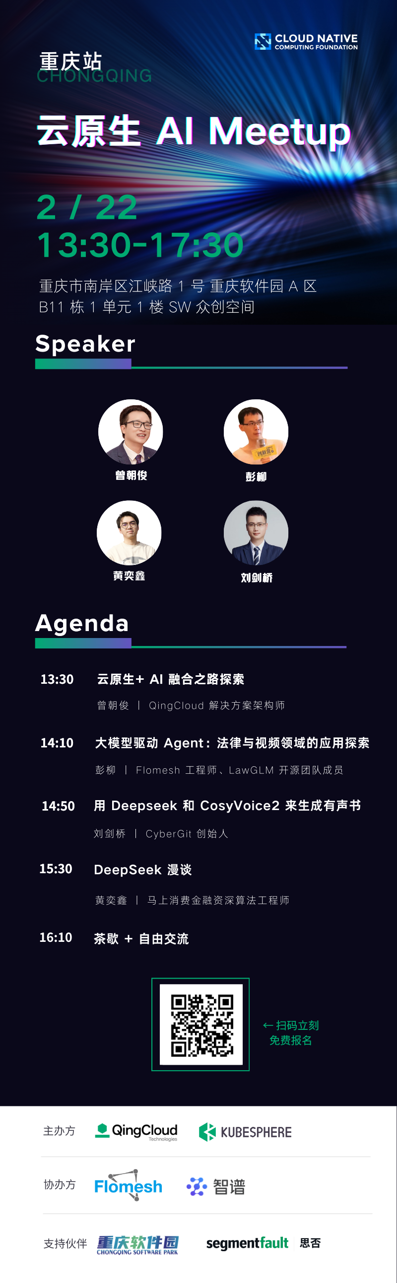 2025年,KubeSphere 社区的首场线下 Meetup 即将到来!我们将于 2月22日 下午在重庆与您相聚,共同探索云原生与AI技术的前沿与实践!我们诚邀您与技术专家一同探讨最新趋势,享受一场充满技术交流的盛会!