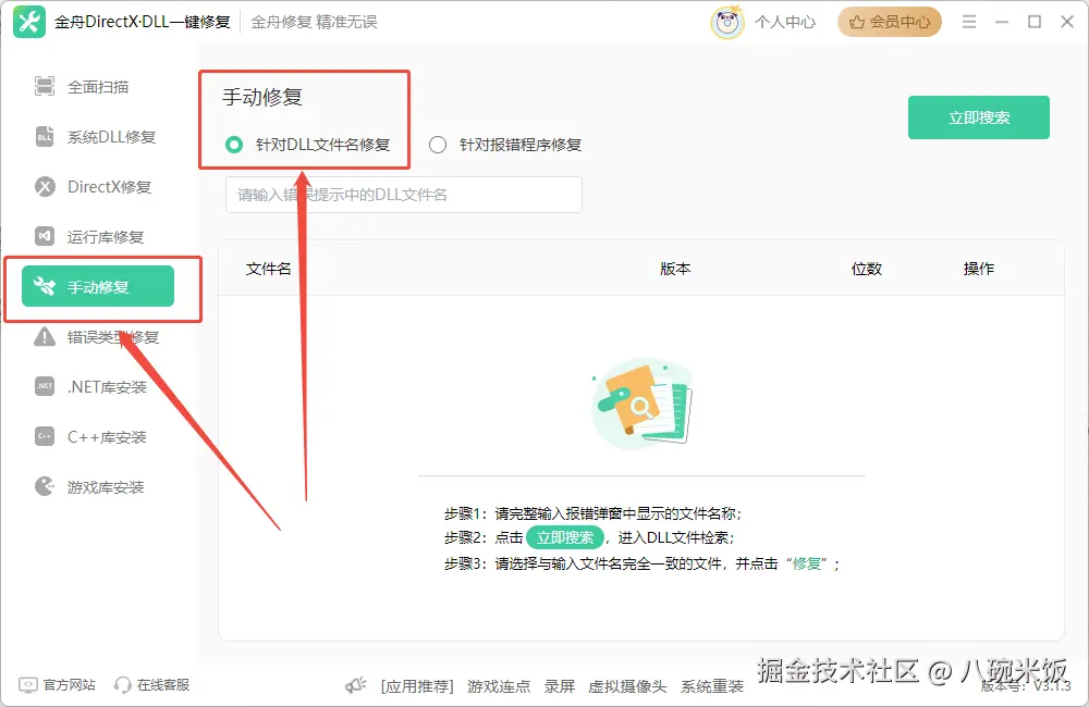 Step1:电脑上运行金舟DirectX·DLL一键修复,选择手动修复,然后针对dll文件命修复
