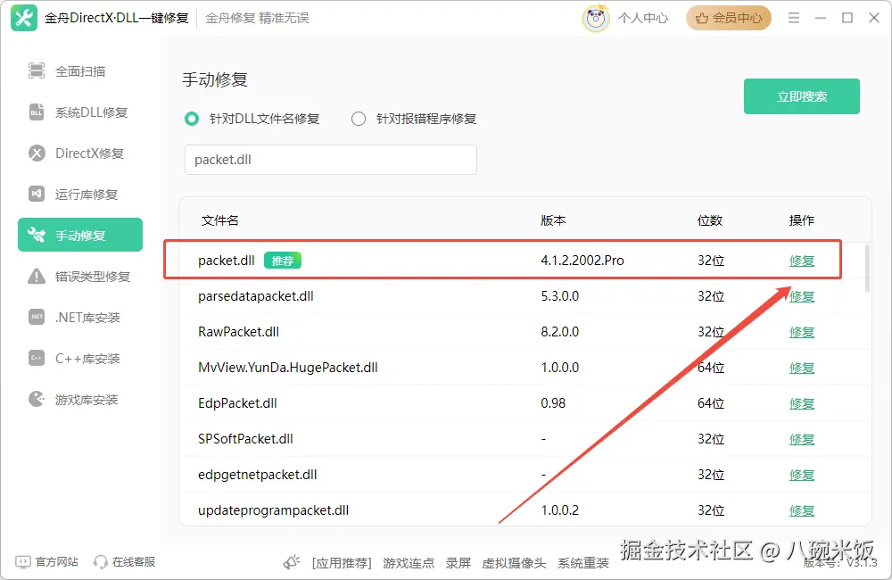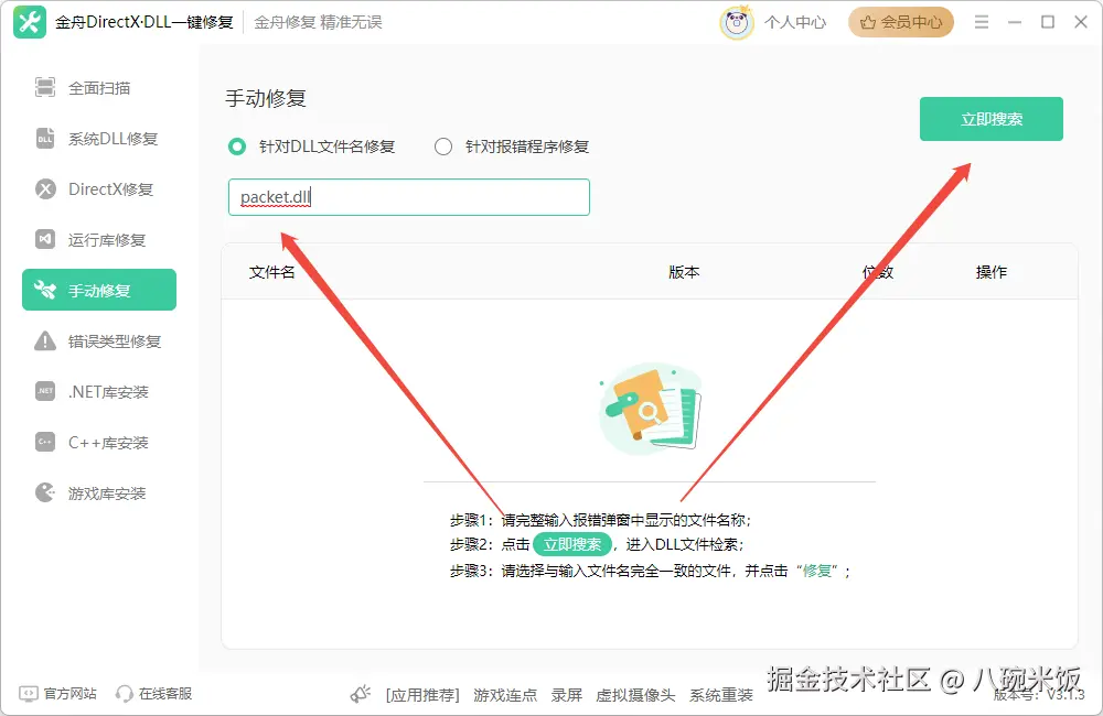 Step2:输入电脑缺失的dll文件名,例如“packet.dll”,点击“立即搜索”