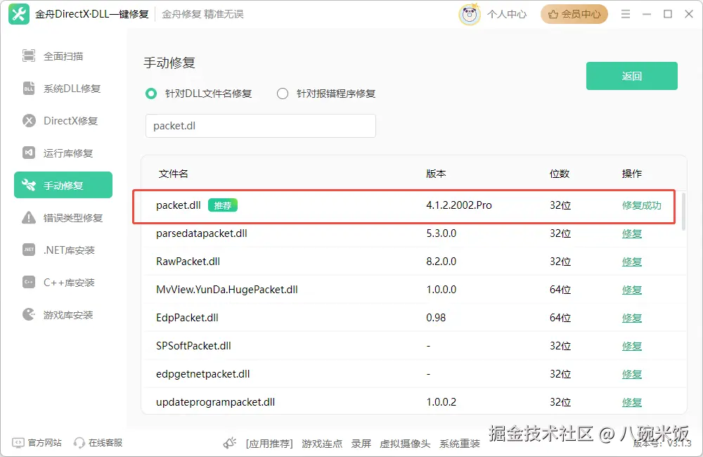 如果方法一不能修复packet.dll文件,那我们可以手动下载丢失的dll文件。这里推荐使用金舟DirectX·DLL一键修复,软件可以帮助我们快速扫描并恢复电脑中任何dll错误,一键修复损坏或丢失的dll文件,包括packet.dll文件,有效解决Windows程序和游戏中的启动问题。具体操作如下: