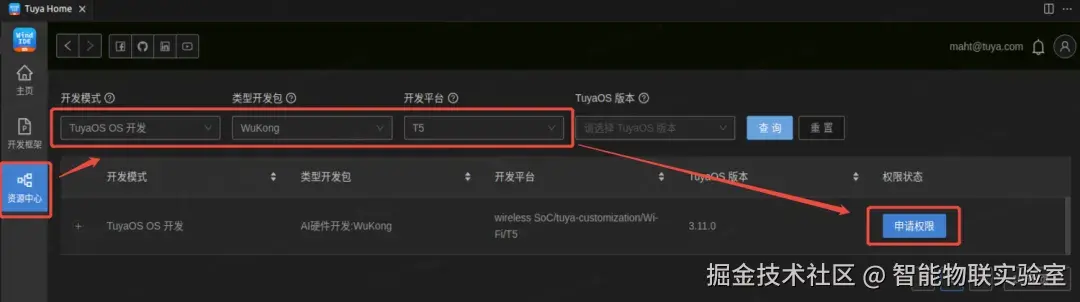 2、启动 Tuya Wind IDE,进入“资源中心”,按照下图选择,申请开发框架权限,填写涂鸦商务邮箱(界面会有邮箱地址提示),即可发起申请。