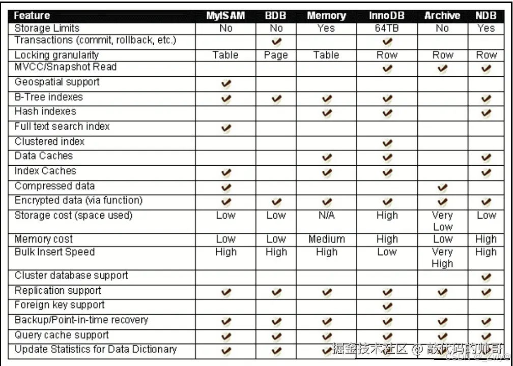 | 特性 | MyISAM | BDB | Memory | InnoDB | Archive | NDB |