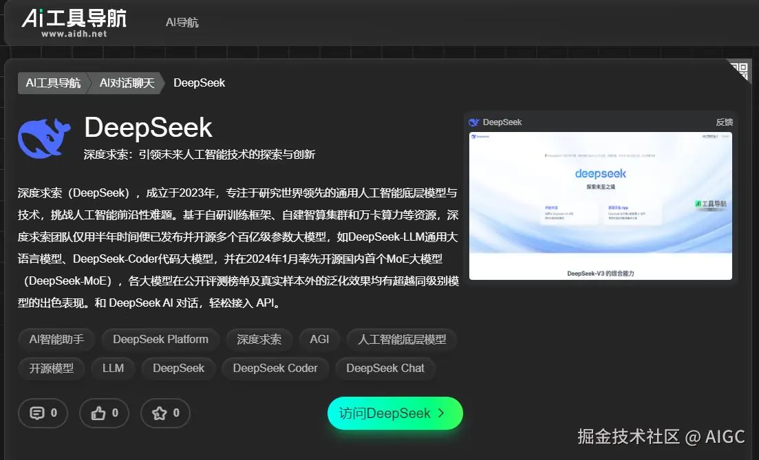 AI 工具箱以 “工具精选、实用性强、社区互动、资源整合” 为核心亮点。虽然工具数量不如 AI 导航网多,但每一款都是精心筛选的精品,实用性和质量有保证。对于想深入学习和使用 DeepSeek 的用户,AI 工具箱可能会提供一些经过筛选的优质教程资源和实用工具,帮助用户更好地掌握 DeepSeek。