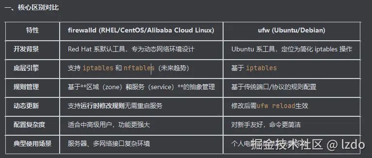 尽量不要混合使用两者!同一系统上同时操作可能导致规则冲突(建议通过 systemctl stop ufw + systemctl disable ufw 禁用不用的工具)