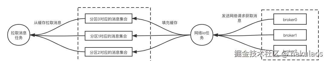 消费者拉取消息也一样,都是先拉到一个缓冲区,再从缓存区拉取消费