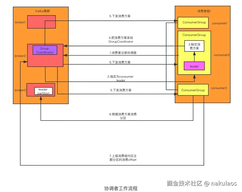 - leader consumer根据GroupCoordinator提供的分区策略和所有消费者的订阅信息确定分区消费方案并发送给GroupCoordinator,然后GroupCoordinator根据收到的分区消费方案把每个消费者要消费的分区信息发送给每个消费者。(下发消息方案)