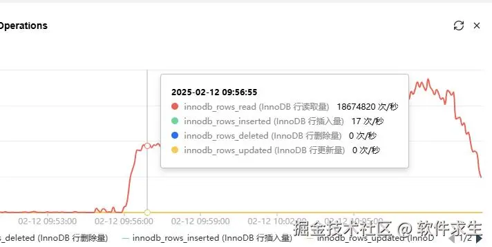 有了方向后,我立刻开始排查。在后台监控的查询统计中,我注意到,在9:56时,InnoDB行读取量飙升到近2000万每秒!这个数据简直让人感到震惊,显然,这个查询负载是一个巨大的性能瓶颈。