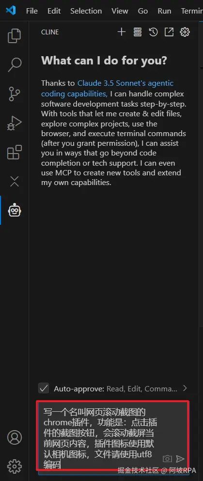 Cline一款强大的 VSCode 插件,他可以配置通过配置大模型API来调用大模型进行编程,使用效果和Cursor的composer,windsurf的cascader功能类似,可以基于项目跨文件编程,使用效果与前两者几乎无差别。