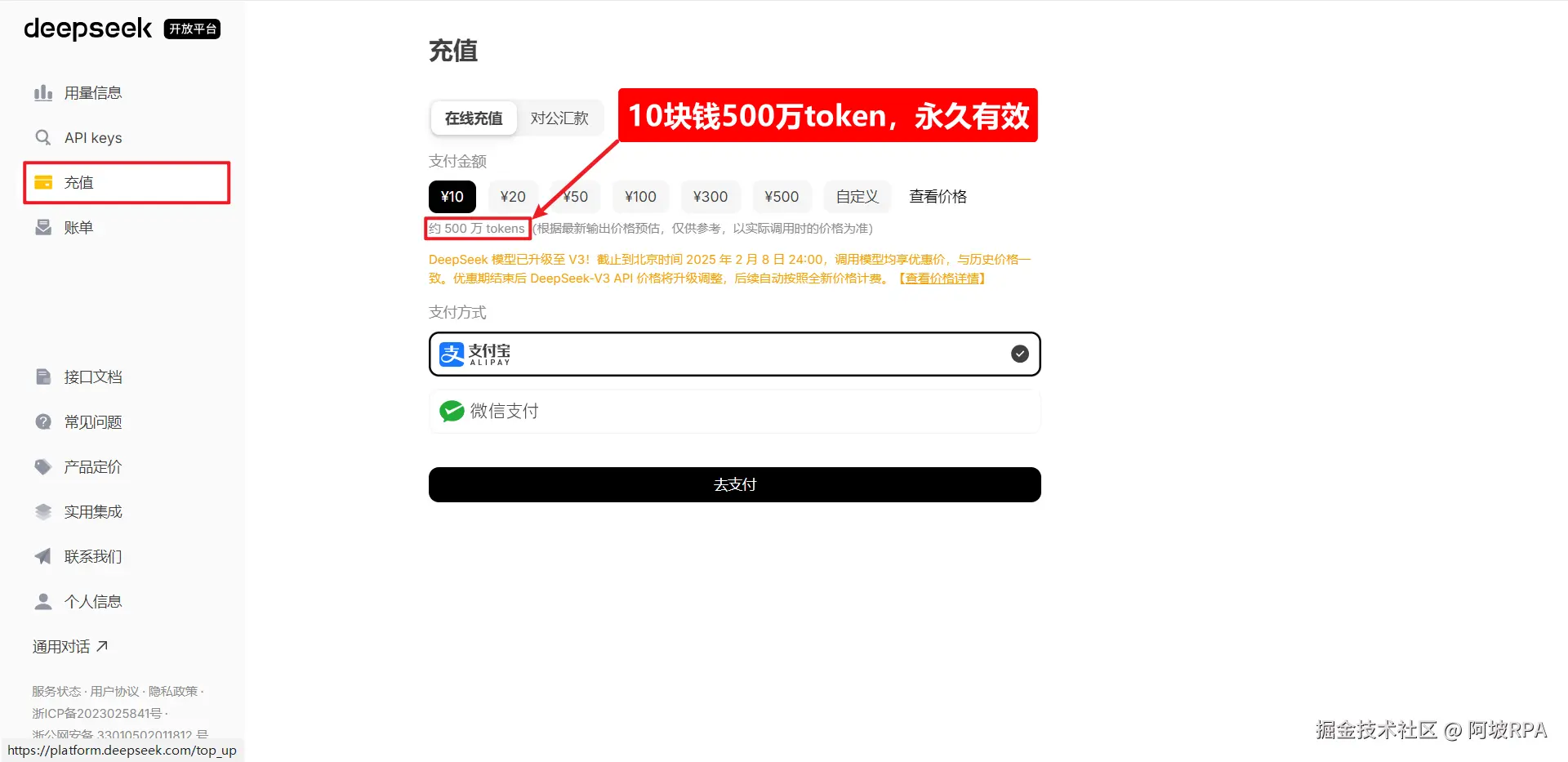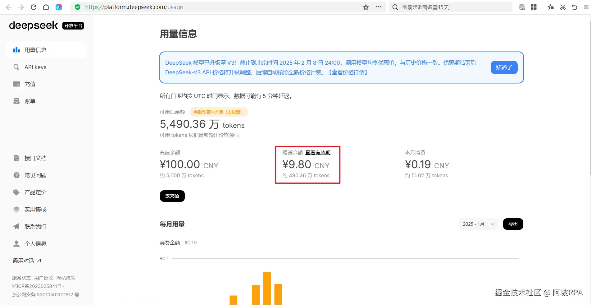 deepseek注册即送500万tokens,有效期1个月,其实尝试上手够用,如果想继续使用,可以充值,接口价格很便宜。