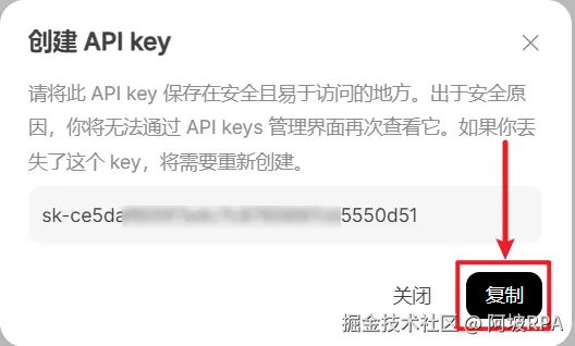复制好自己的apikey,保存好,切勿泄露自己的api key