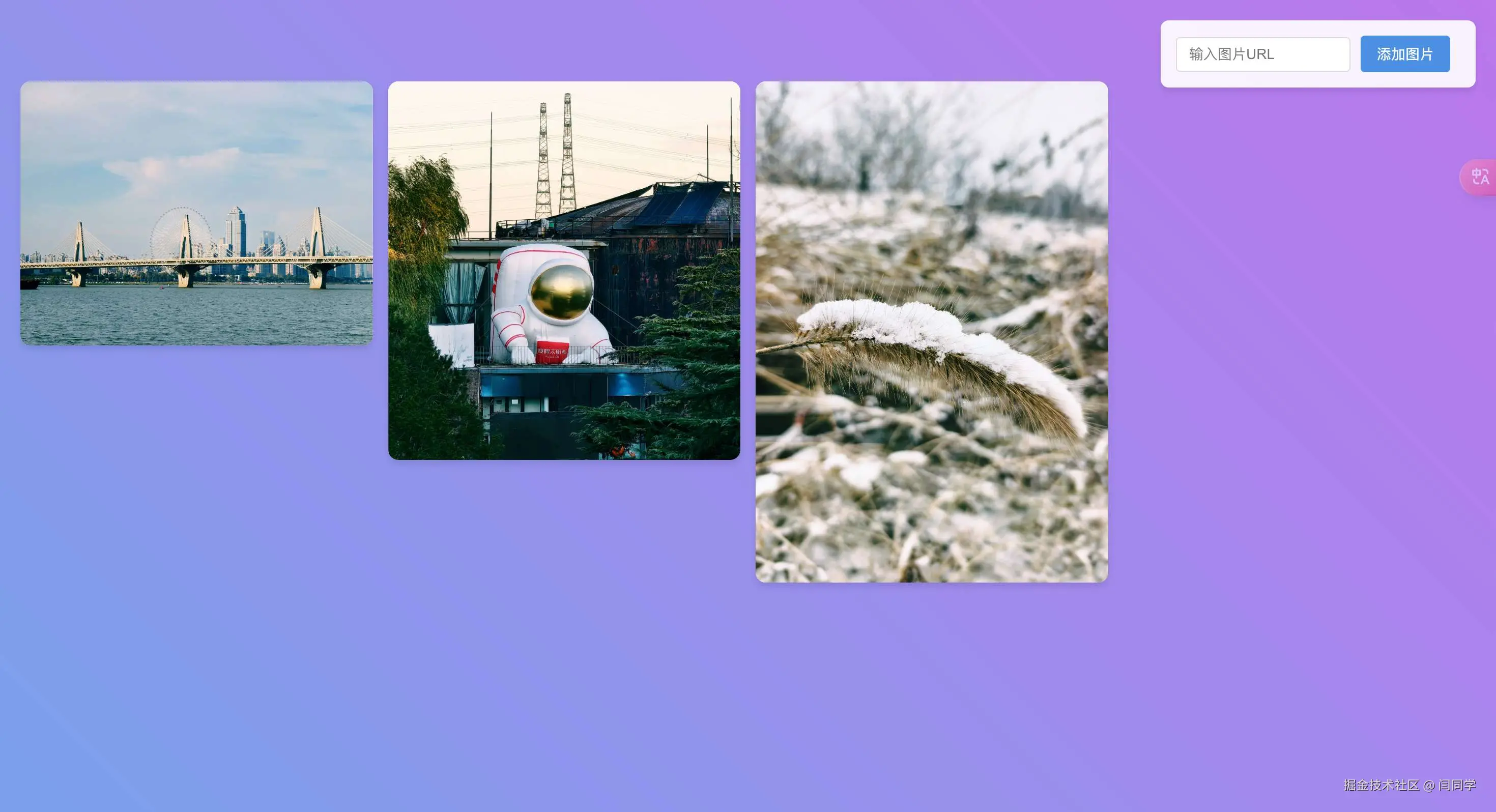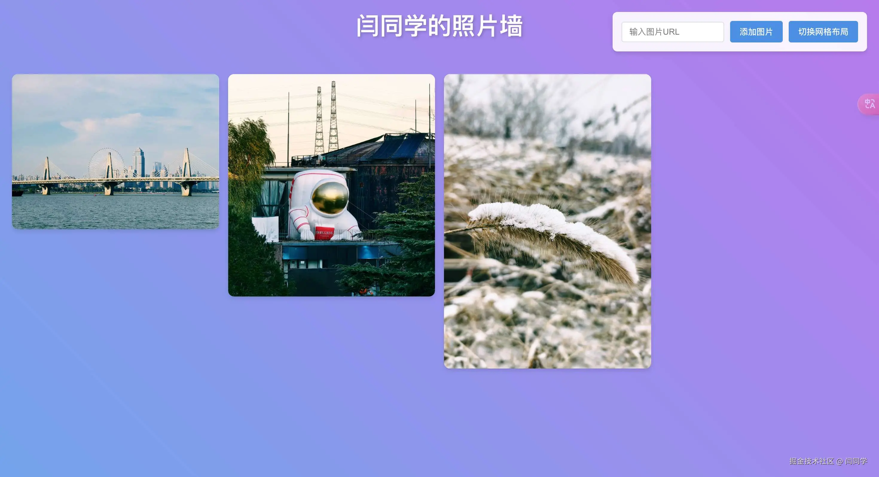 然后我们按照提示打开网页,就出现了我们想要的这个照片墙应用。说实话和我想象的还是比较切合的。甚至比我描述的还要好,因为我描述的是修改图片路径,这里直接给出了添加图片的输入框,显然比修改更加直观。