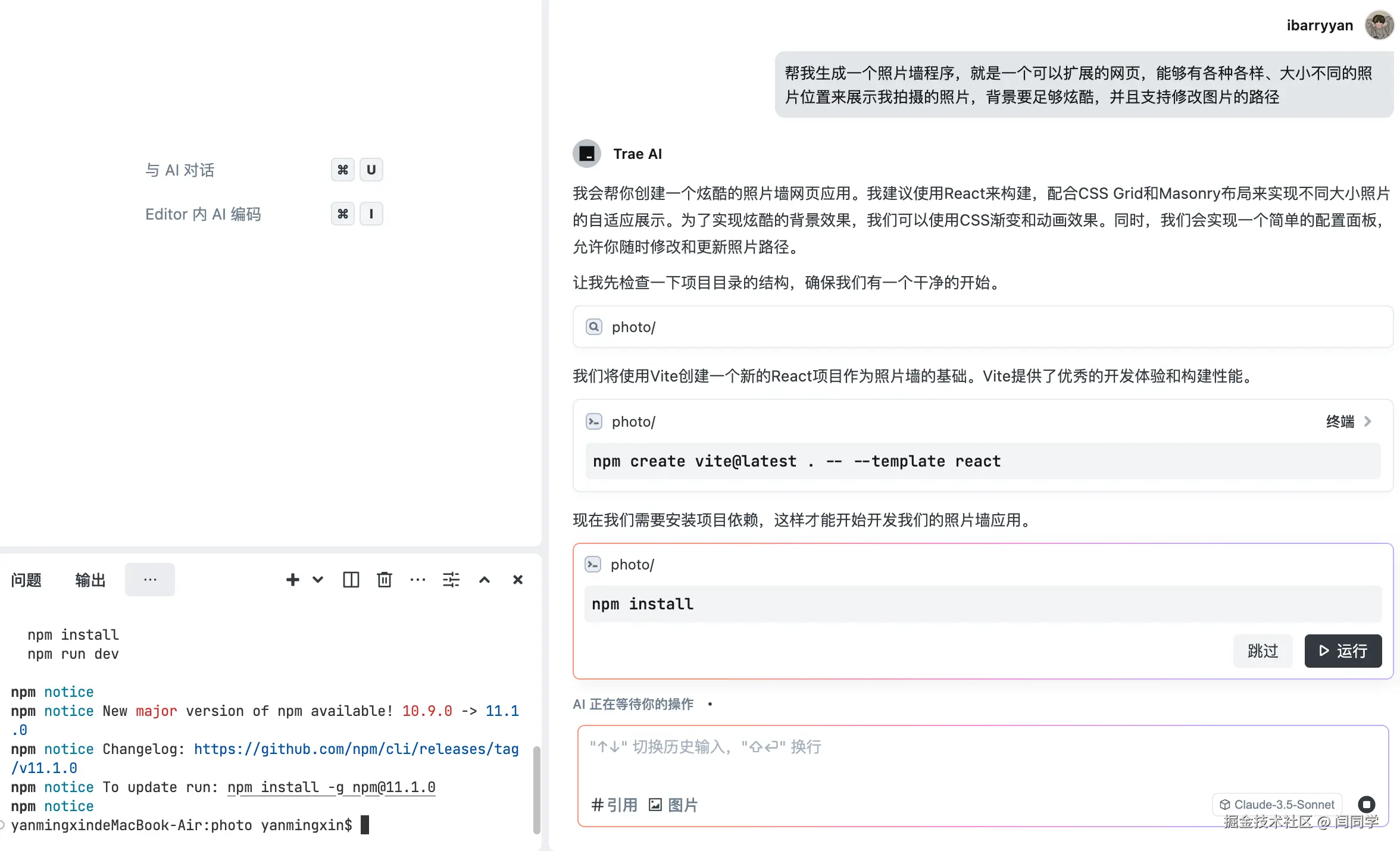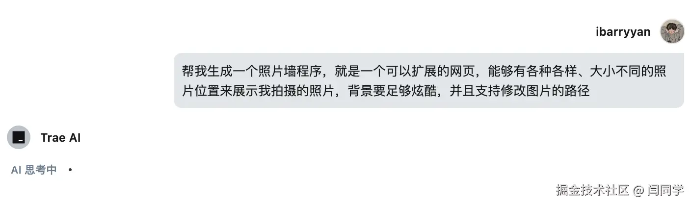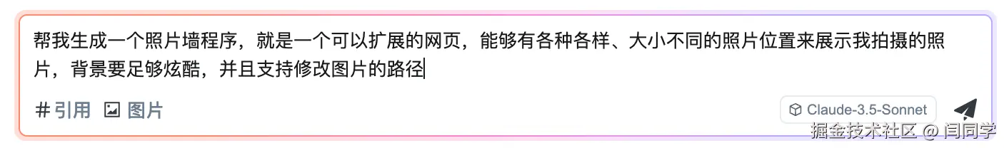 然后我们尝试使用自然语言描述,让IDE为我们自动生成一个项目,因为我本人有摄影的爱好,所以就让它帮我生成一个类似于照片墙的程序,可以通过下面这张图片看到我的指令: