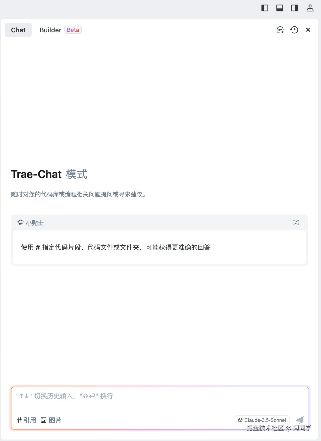 首先在IDE主页面的右上角会有一个按钮,可以让我们打开侧边栏,这个侧边栏就是AI辅助工具,但是它有两个选项:Chat和Builder,其中: