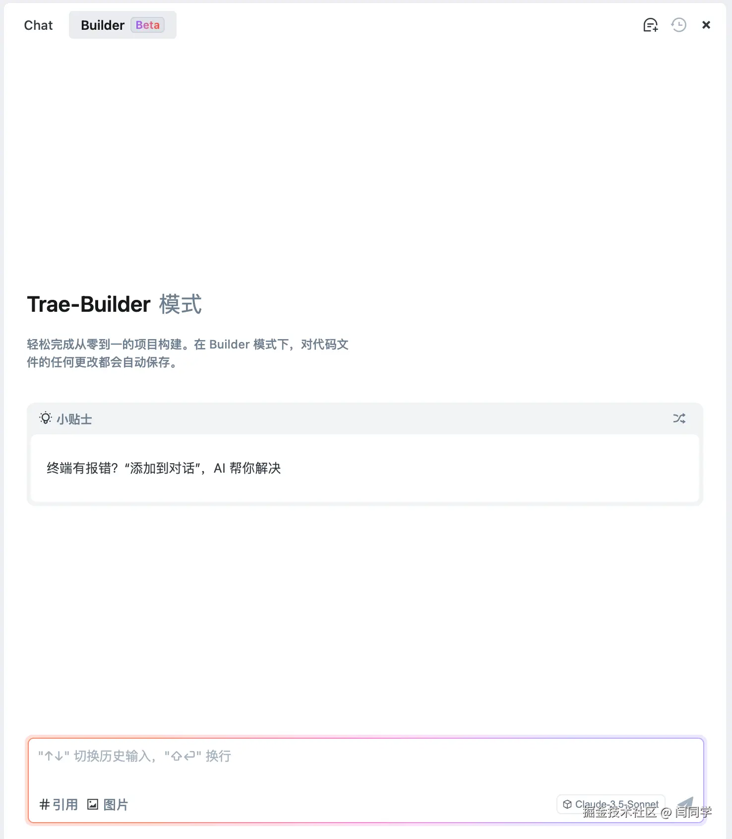 Chat就是和网页上对话式AI类似的对话框,可以为我们提供一些AI的智能问答对话形式的辅助,而Trae的核心则在于Builder,通过名字我们也可以大致能够猜到,这个应该和自动生成代码有关系,那么我们本次就来重点关注一下Builder这个功能。