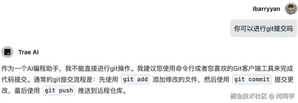 然后还有个问题,我也好奇的问了一下,哈哈哈~,显然,它还不支持提交git。