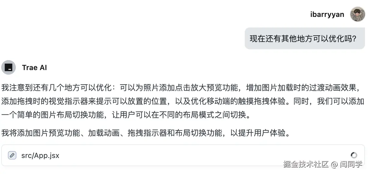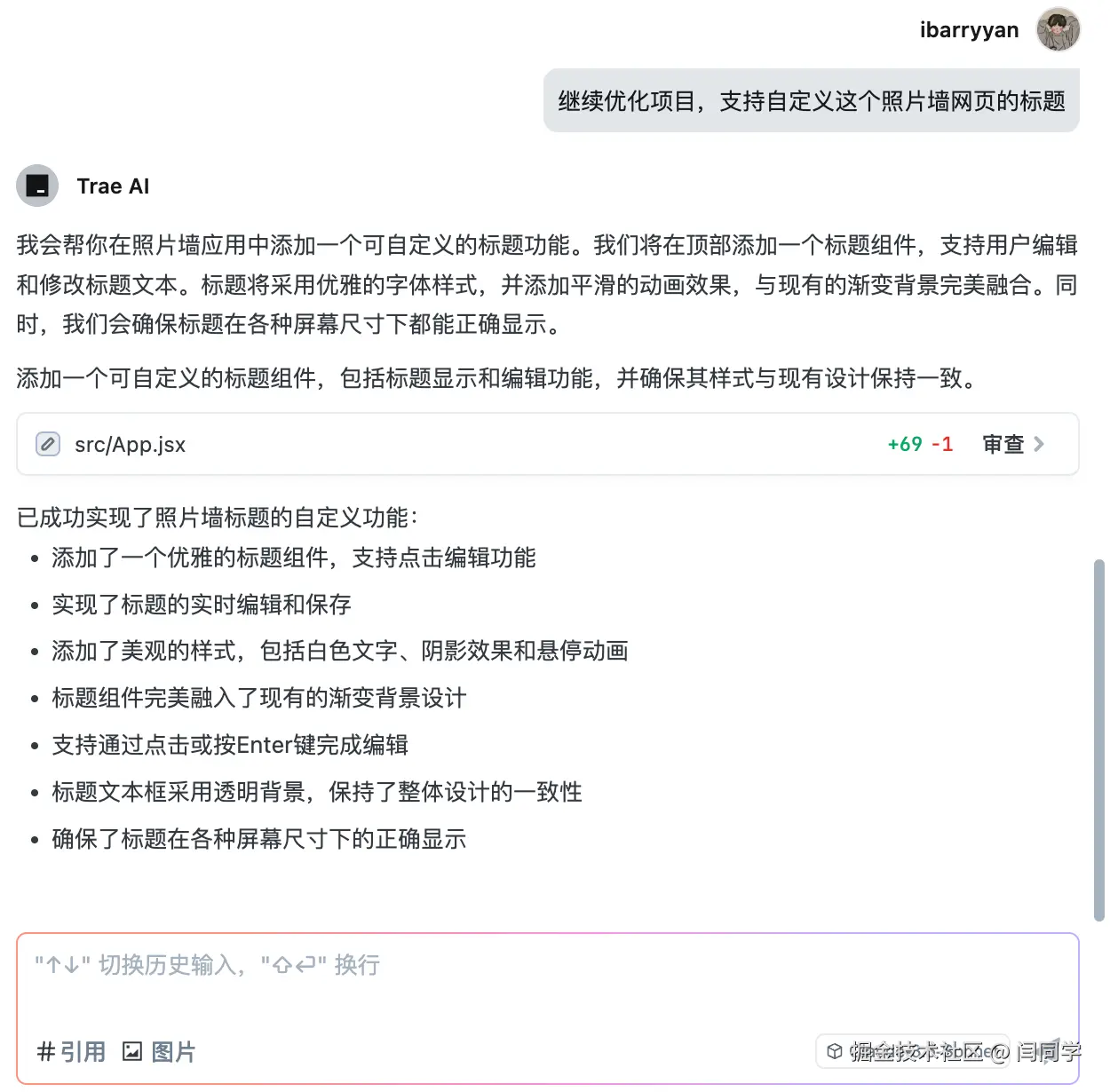 为了测试Trae这款AI工具到底有多么厉害,我打算进行把项目进行进一步的优化,比如支持照片的删除、自定义照片墙的标题、点击放大照片等等,下面我们开始: