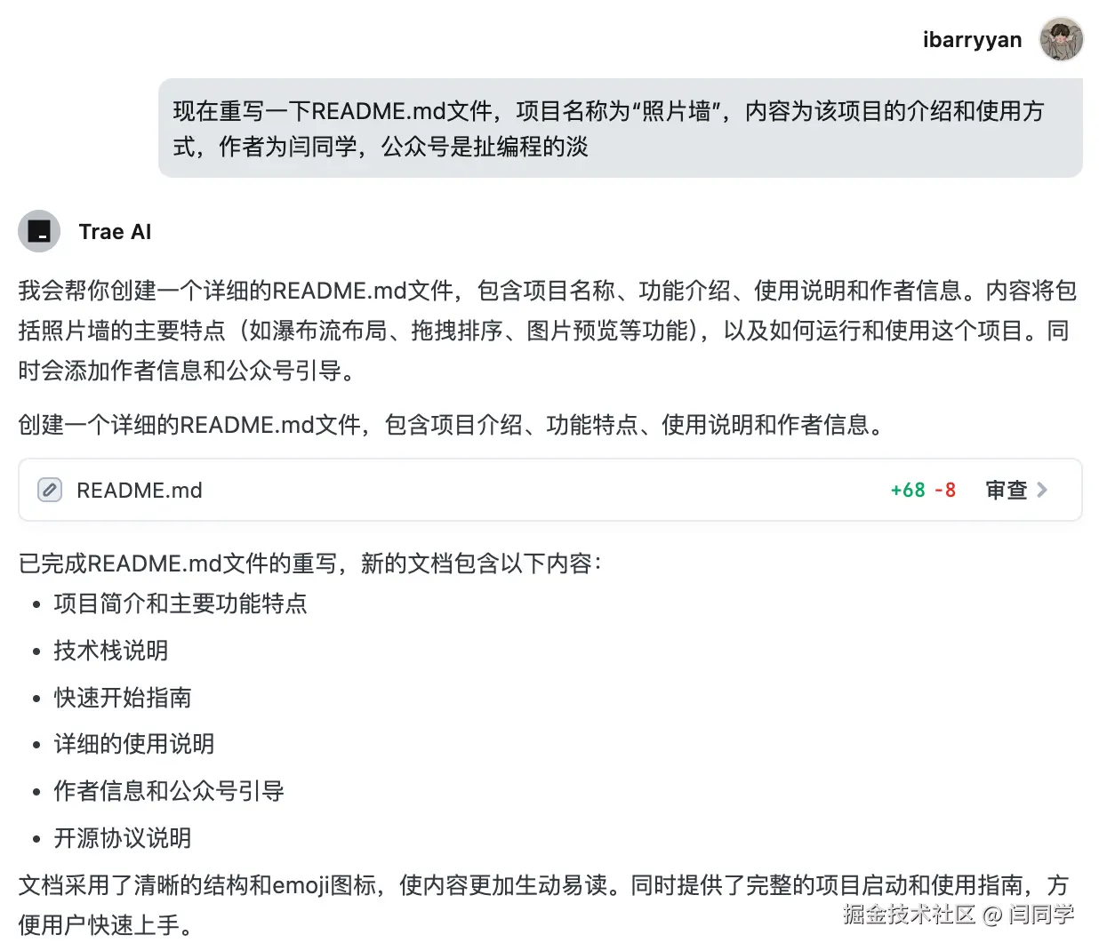最后,我打算在把项目提交到Github之前,让它帮我重写README文件,测试一下它的文档能力: