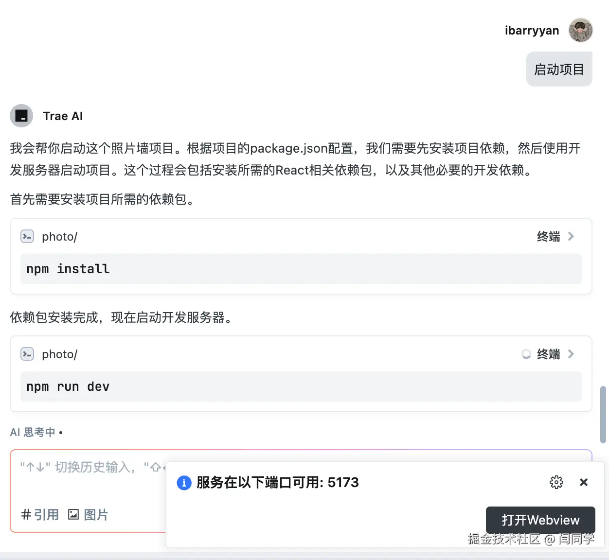 发送给AI后先是思考了一小段时间,然后在回答中说明了要给我创建一个应用,以及这款应用将要使用的技术栈等信息,并且给我们提示命令生成项目,这些命令需要我们主动点运行按钮才能被终端执行。