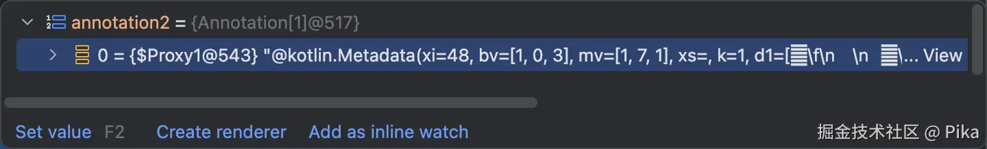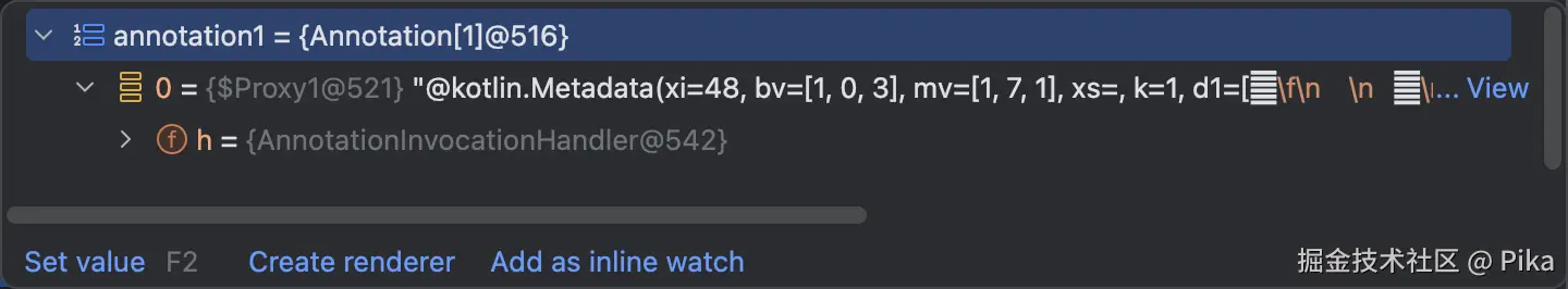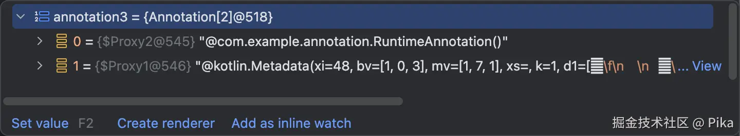 其中MyTest1 以及MyTest2都保留着一个metadata的注解,这是因为这两个类都是Kotlin的class,但是我们自定义的注解在运行时没有看到,MyTest3不仅存在着metadata的注解还保存着我们自定义的注解,这里的结论跟我们上面说到的八股文结论一致,那么接下来我们就要从不同的视角上看其运作机制