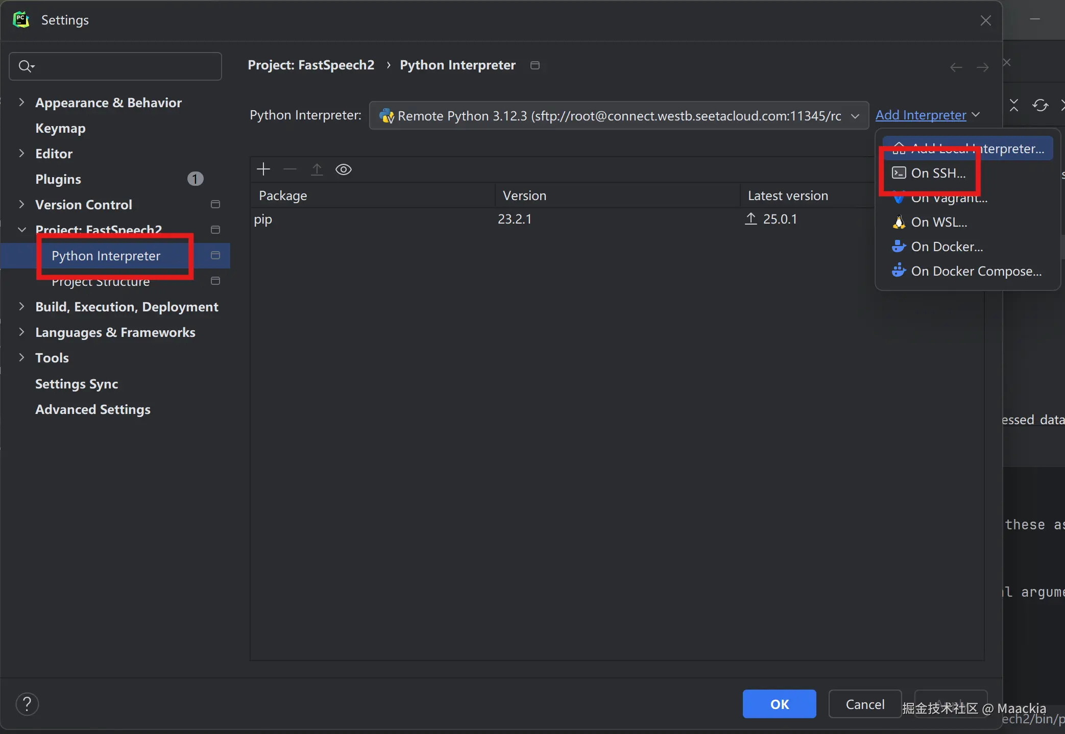 - Setting→Python Interpreter→Add Interpreter→On SSH