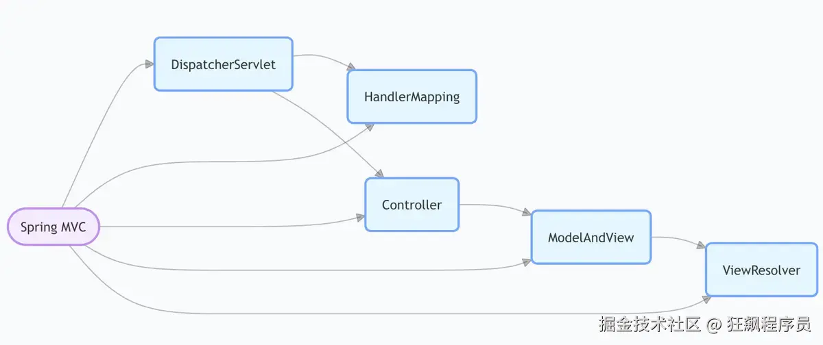 Spring MVC 的核心组件包括 DispatcherServlet、HandlerMapping、Controller、ModelAndView、ViewResolver 等,下面分别介绍这些组件的作用: