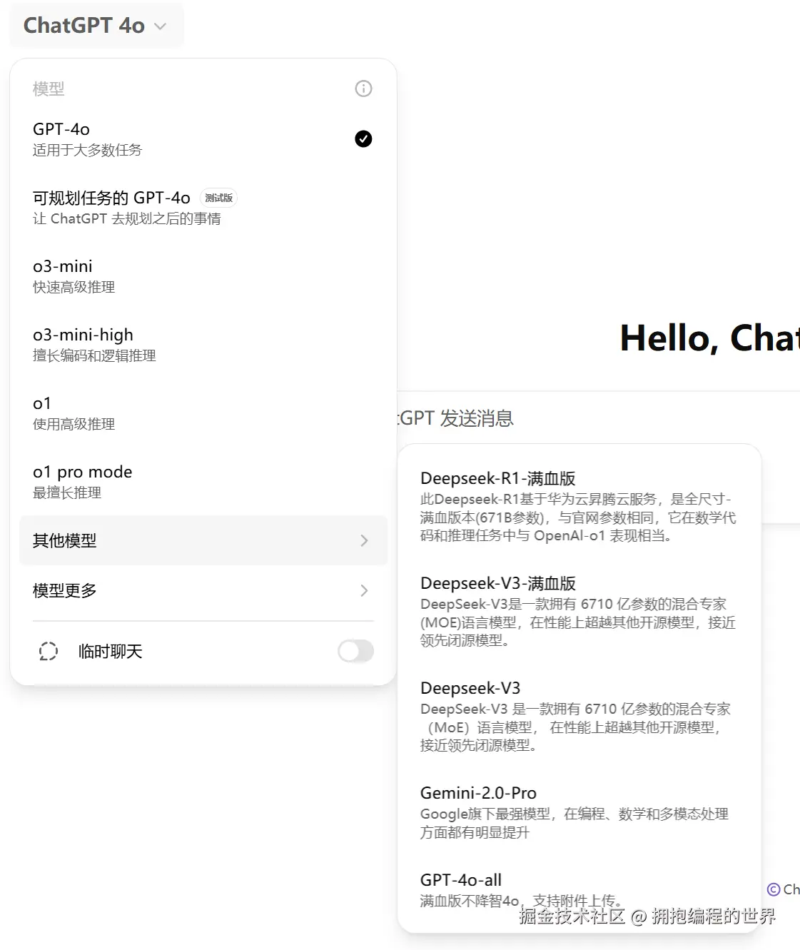 如果觉得官方月供比较贵,也可以加我微信,有国内镜像可用,价格实惠,和官方正版基本无差别!注意不是套盒网站!不是套盒网站!不是套盒网站!并且和官网功能同步,内含 满血版deepseek-r1/v3,gemini 2.0 pro,与GPT中的高级模型搭配使用效果更佳。新版入口内四大高级模型:o3-mini,o3-mini -high,o1,o1 pro mode均为满血版本,欢迎体验~ (查看更多信息含国内镜像详细点击:教程)